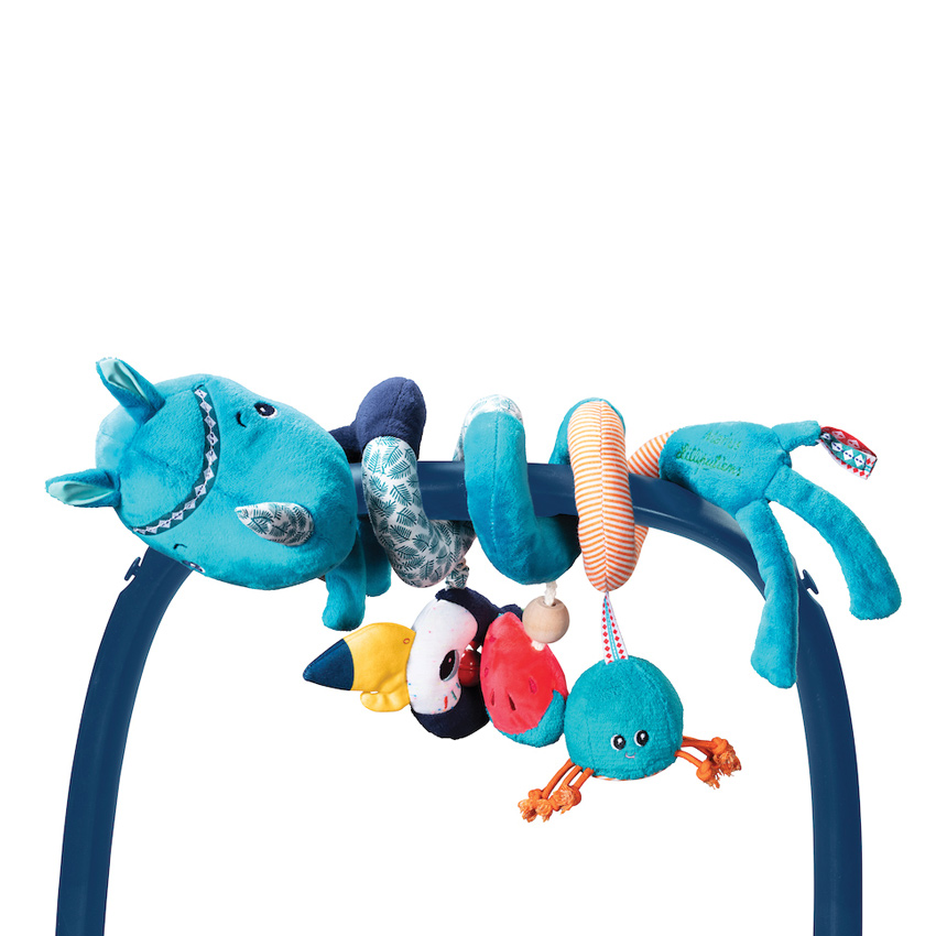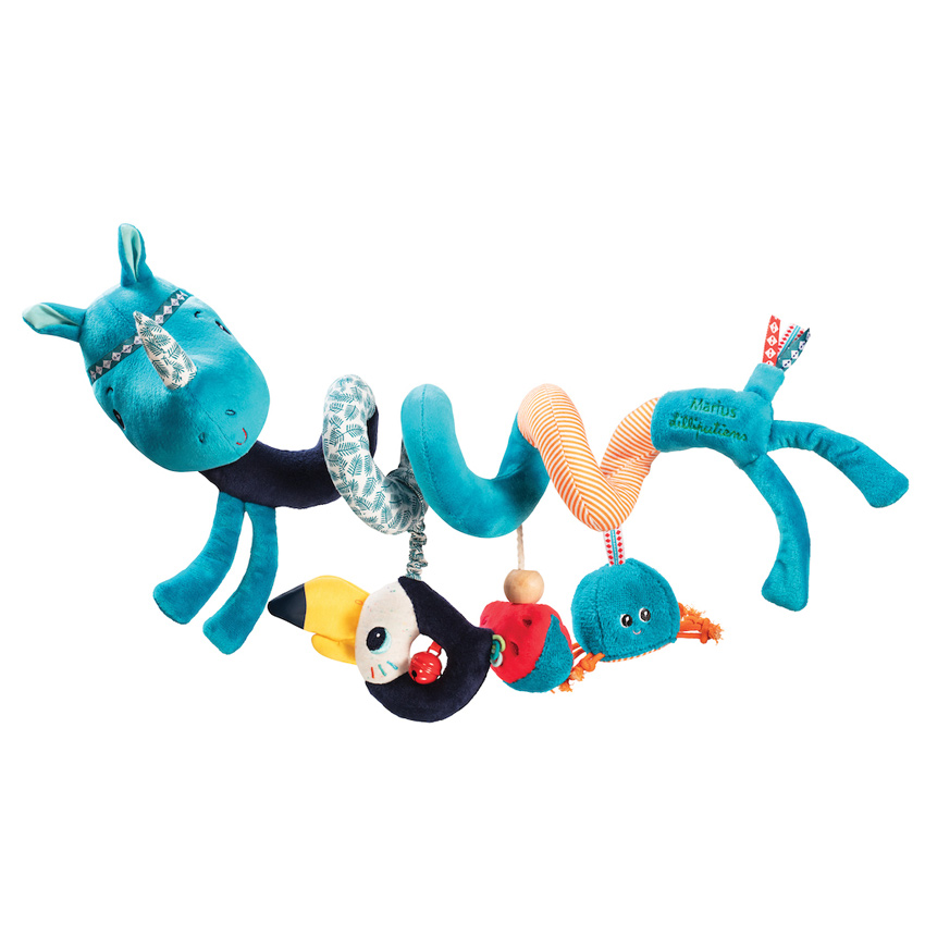 Marius the rhino offers a range of activities and surprising discoveries to delight baby wherever they sit. Wrap him around the pram handle, cot or play pen and let the attachments weave their magic. Grab hold of Marius's legs for that scrunchy sound the little kids love so much! The hanging embellishments include a toucan with a bell, a crab with a mirror and rattle and a cute piece of watermelon to inspire movement and play. So many activities to keep baby happy combined with fabric textures and prints ensure Marius Activity Spiral will be loved by baby and entertain for ages!