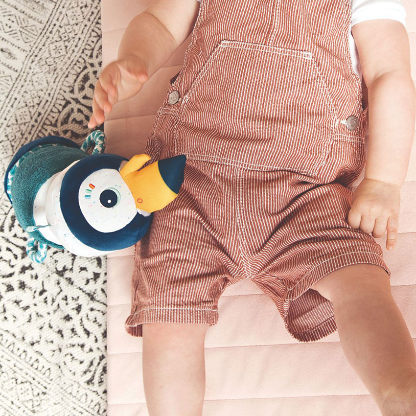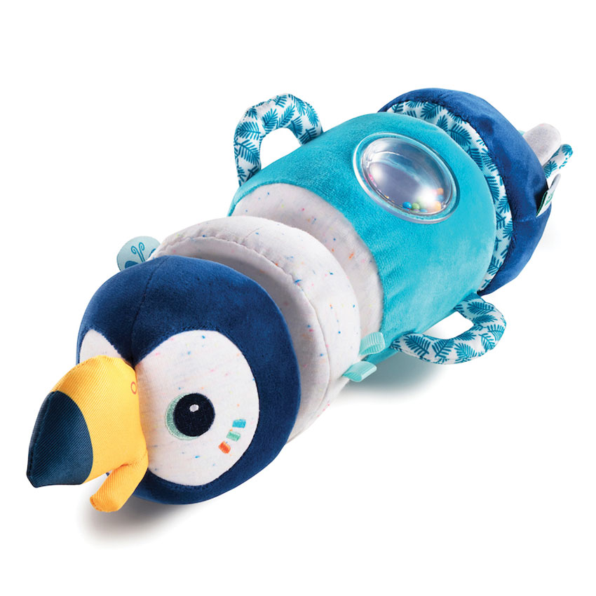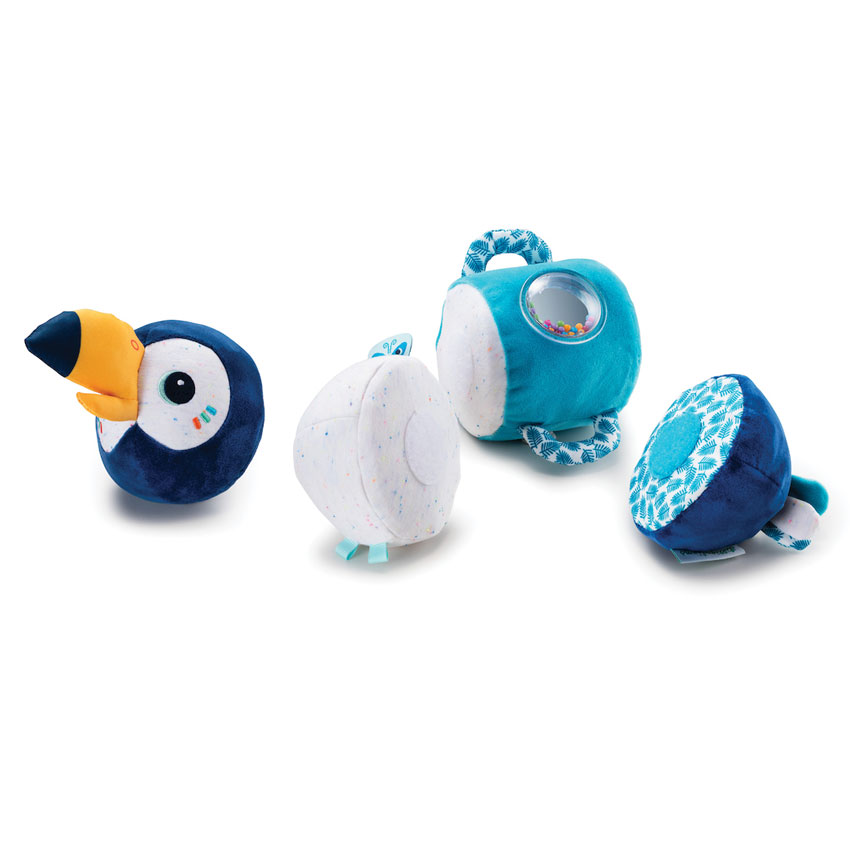 4 rattles in 1! Each colourful part of Pablo's body makes a different sound and is a source of imaginative discovery for little hands. Pablo Toucan Sound Roll has been created to help children develop concentration and fine motor skills from early on. Shake Pablo's head to hear his tweet, or his neck to hear the tinkle of a bell. His body has a ball rattle with a mirror so you can see the balls moving around and his bushy tail has a scrunchy sound. Covered with brightly coloured, textured fabric, the segments can be taken apart and put back together easily thanks to the velcro strips and it has handholds and embellishments for extra play. You can even leave a few bits out for some cheeky fun! Filled with eco-friendly stuffing made from recycled plastic bottles, Pablo Toucan Sound Roll is perfect sensory entertainment for babies and assembling fun for toddlers!